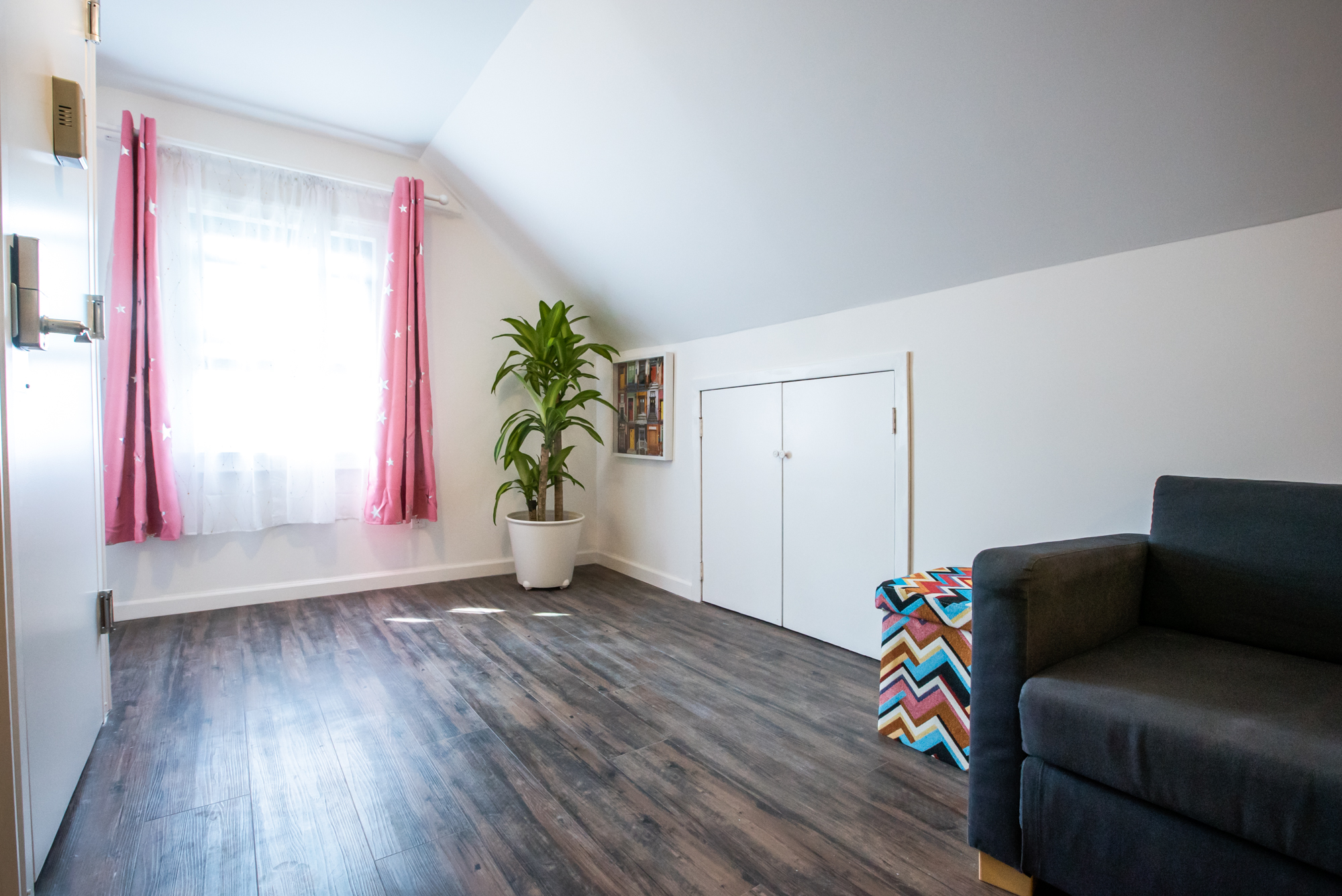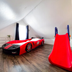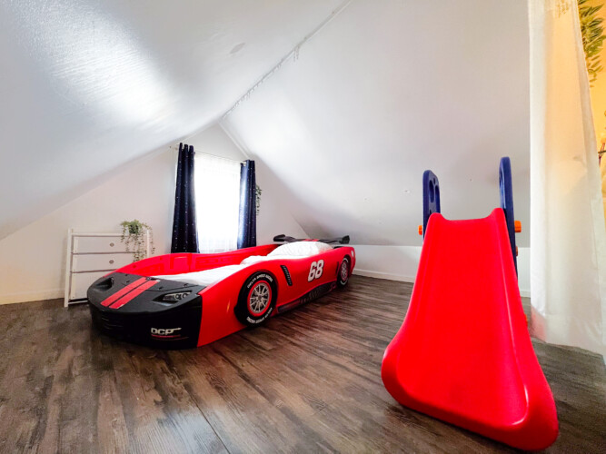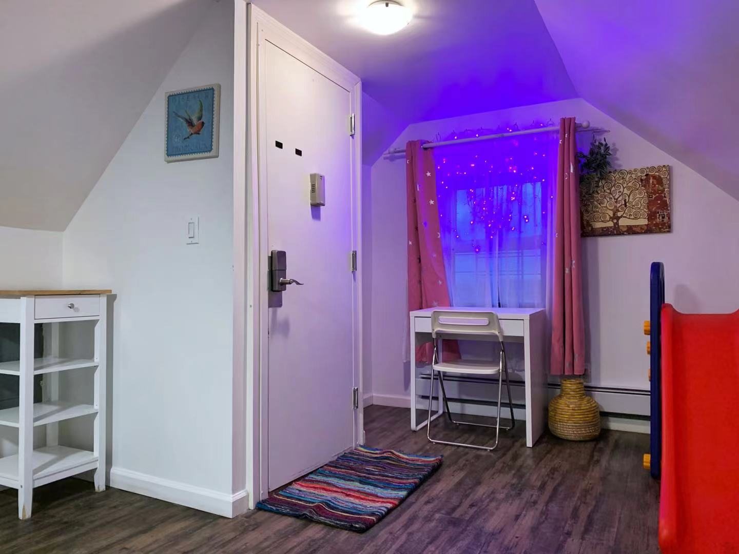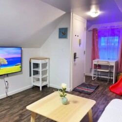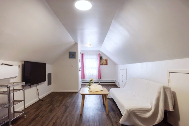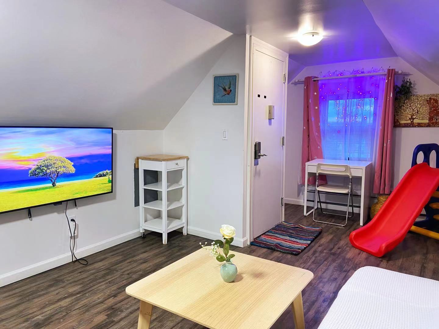 Welcome to this beautiful home in Murray Hill/East Flushing, Queens. Offering a family-friendly environment in this 1000 sqft open-concept studio loft with a great view overlooking the neighborhood and Kissena Park. Complete with a gated courtyard featuring an outdoor kitchen, BBQ grill, pizza oven, dining area, and a rooftop terrace. This fourth-floor guest home is ideal for 1–3 guests and can accommodate up to 4-5 persons. BEDROOM AND BATHROOM: – The bedroom area features a luxury queen-size memory foam bed , a study table & chair, a bookshelf, and a closet. – The children’s area features a fun car bed with 2 twin-size memory foam mattress (38” x 75” bed) and a fun slide. – The bathroom is equipped with a Japanese-style high-tech bidet toilet and a stand-in shower LIVING ROOM: -The living room area features a comfortable sofa (which can be temporarily used as a sofa bed) and a 50″ 4K Smart TV. – A fireplace, floating book ledges, and an entertainment stand with a beautiful view overlooking the town KITCHEN AND DINING: – The fully-equipped kitchen has a 2-range electric stove, a microwave, a toaster, a fridge, and kitchenware. – An adjustable 2-4 seater dining table SMART HOME FEATURES: – Secured Keyless Entry – 50” 4K Smart Roku TVs with an easy-to-use interface – Japanese-style smart bidet toilets OUR HALLMARK AMENITIES: – An in-suite laundry washer. – Our guest home is furnished with comfortable memory foam beds, lamps, fireplace, and blackout curtains. – Work/study table and chair. – A quiet 3-in-1 ductless AC, heater & dehumidifier. (The loft is partitioned by curtain dividers, with the bedroom being split into two sections, while the living room and bedroom are also separated. It’s important to note that the loft doesn’t have an elevator and certain areas have limited headroom) INTUITIVE DESIGN – No stairs once inside the apartment – Entrance is over 32″ wide – Soundproofed walls – A pack n’ play can be provided upon request – Specialty maternity meal service across the street LOCATION: – Our guest home is located in a quiet and safe suburban neighborhood in Murray Hill/East Flushing, just a pleasant walk to Kissena Park. Enjoy the beautiful Kissena Lake Loop Walking and Running Trail. – It is conveniently located next to a 24/7 bus stop, supermarket, laundromat, salon, and various restaurants, bars, and stores nearby – Our guest home is nearby Flushing Hospital, 0.5 miles from The Long Island Railroad Murray Hill Station, 1 mile from Downtown Flushing, and just 10 miles from Midtown Manhattan. OUR COMMITMENT: We are committed to ensuring your satisfaction throughout your stay, and we’re pleased to share that over 80% of our guests choose to return or extend their stays with us, underscoring our dedication to serving our guests. Extended Stay: We prioritize our guests’ needs and will notify you before accepting other guests’ booking requests once you inform us that you are considering extending your stay. Pricing: Considering New York’s high cost of living and utilities, along with Airbnb’s 14-22% service fee, we strive to offer a guaranteed all-inclusive price with no hidden fees. The discounted price, reflecting fair market rates, is integrated into Airbnb pricing. Viewing Request: We understand you might be interested in physical viewings, which is not possible. Kindly note that Airbnb prohibits contact outside the platform before a reservation. To explore the space virtually, please use your smartphone camera to scan the QR code in the listing photos and enjoy a video tour.